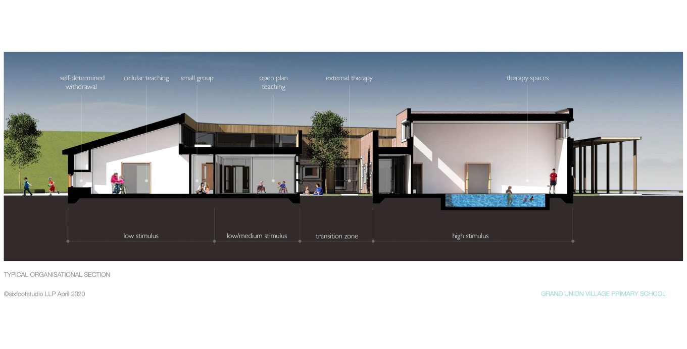 The building is split between the street front/public spaces, classed as high stimulus areas, such as school office, hall and high-stimulus therapy, to the north and low stimulus areas, such as teaching and quiet therapy opening up to the Green Belt to the south.