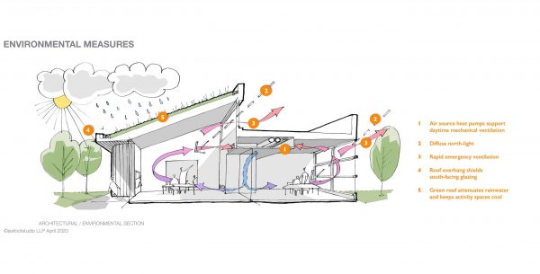 The building is designed to sit low in the landscape, with a turf roof and timber cladding to reduce the impact on the neighbouring properties.
