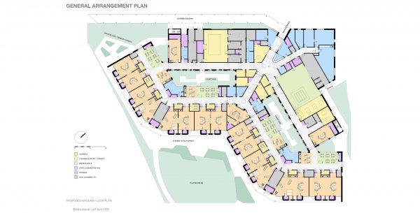 The building is split between the street front/public spaces, classed as high stimulus areas, such as school office, hall and high-stimulus therapy, to the north and low stimulus areas, such as teaching and quiet therapy opening up to the Green Belt to the south.