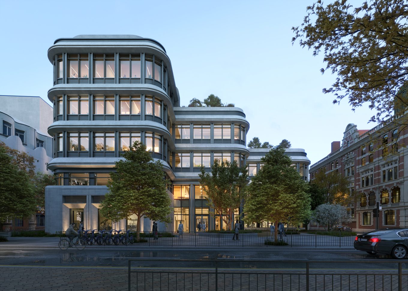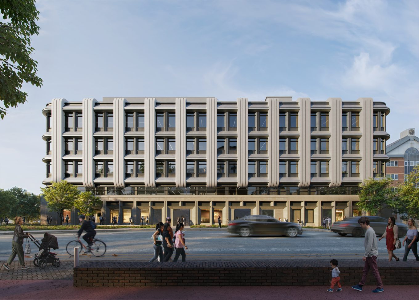 The building envelope and massing have been carefully shaped to respect neighbouring buildings, optimise daylight, and minimise environmental impact. Distinctive stepped massing and vertical façade ‘ribs’ along the east and west elevations serve as solar shading, reducing overheating from low-angle sun, and protect daylight for neighbouring properties. They also serve as integrated ventilation risers, which free up internal space and support the building’s sustainability goals. Materiality and contextual references ensures the new building sits harmoniously within its historic setting, adjacent to Charter House and the Terraces Conservation Area.