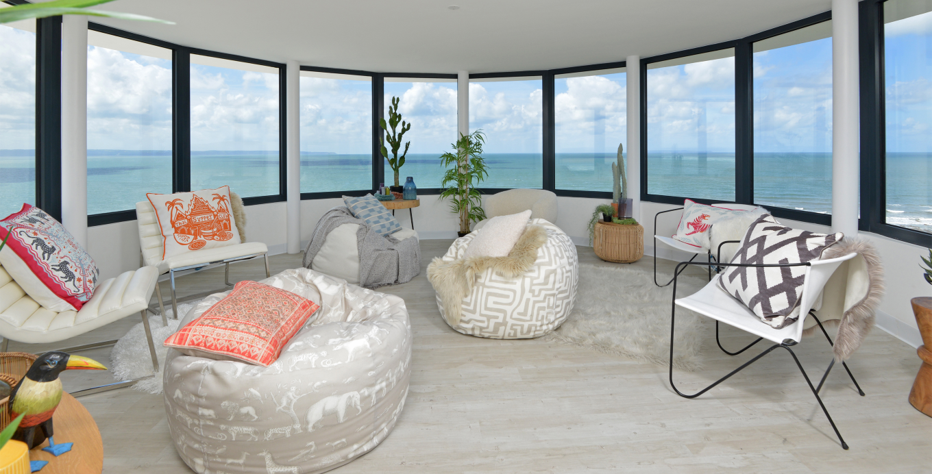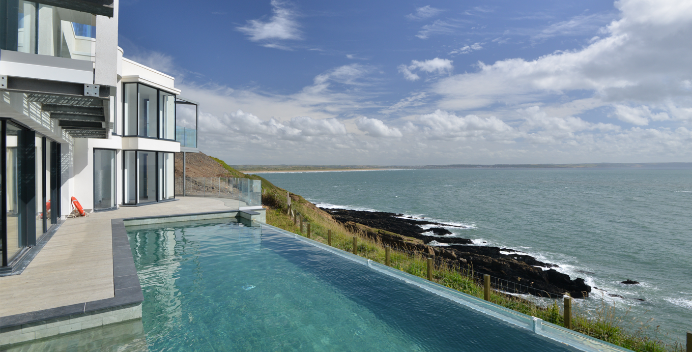 The development is now a beautiful and spacious residence on three acres of land, with spectacular, panoramic views over the sea from Saunton Sands and Croyde Beach to Baggy Point and Braunton Burrows. The design for Chesil Cliff House, by Professor Alan Phillips, references a lighthouse, with a circular rotunda standing four storeys high and offering wraparound sea views, fully integrated with the extensively glazed, two-storey body of the building.